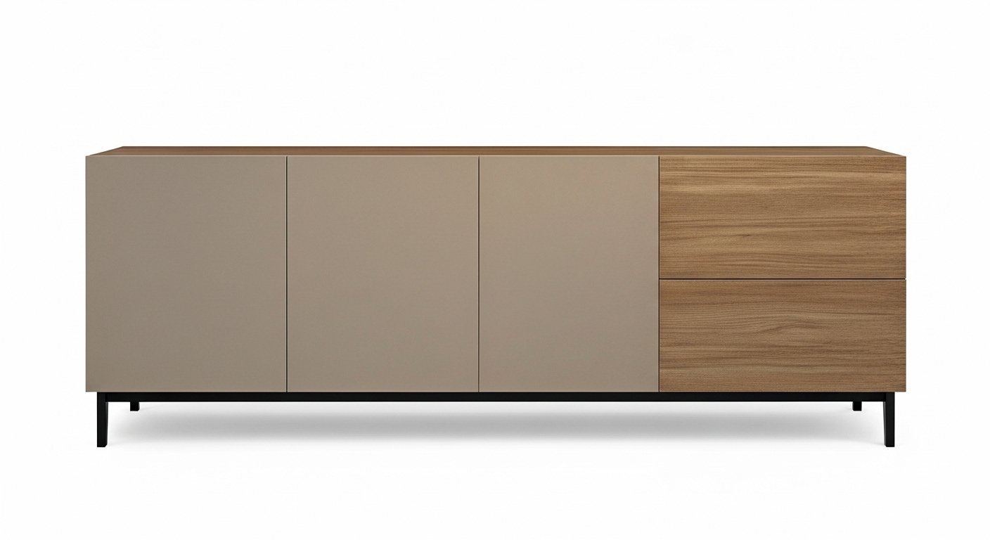A sleek modern wooden sideboard combining matte beige panels with warm walnut wood texture.