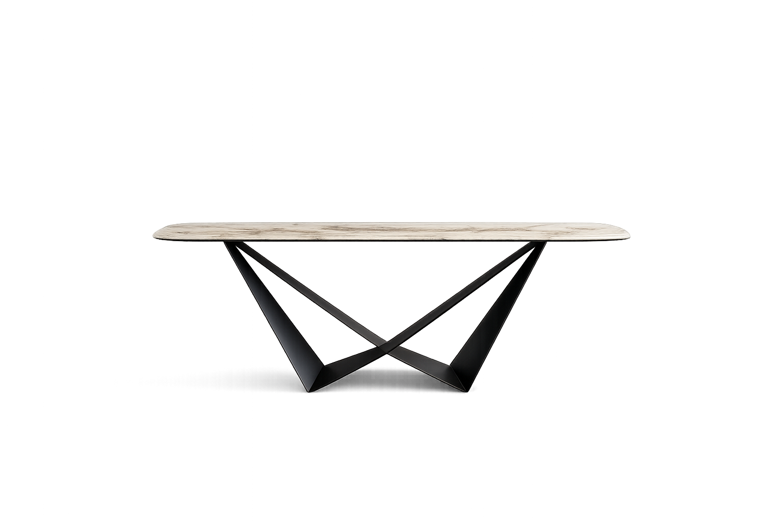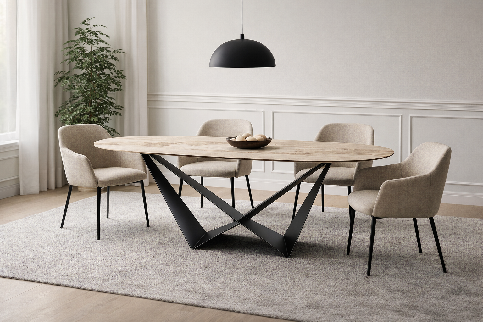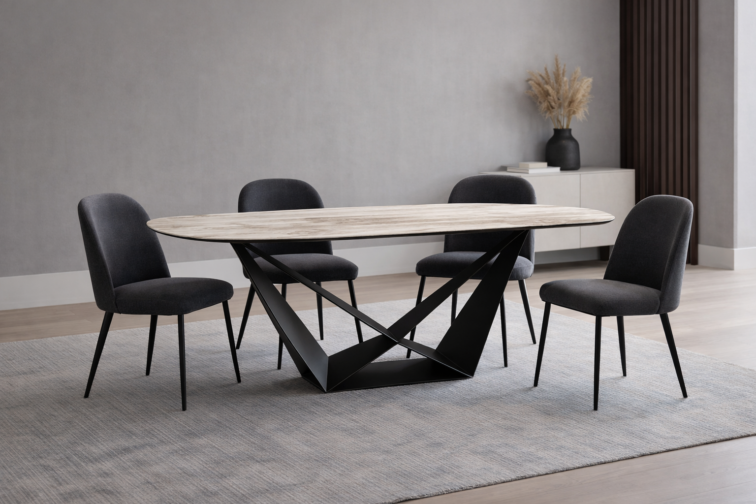 The GeoLine Console Table features a premium porcelain or marble top elegantly supported by a sculptural stainless steel base in a matte or metallic finish.