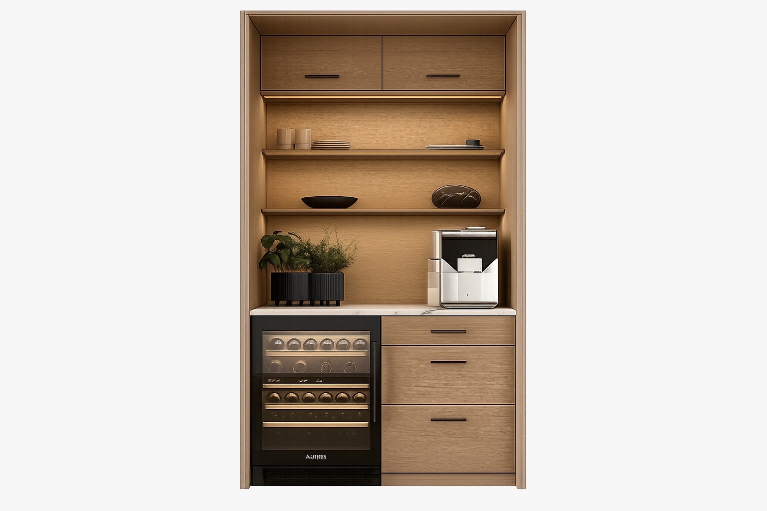 A built-in coffee and wine bar crafted from light natural wood and a premium porcelain countertop, featuring integrated LED lighting and a compact wine cooler.