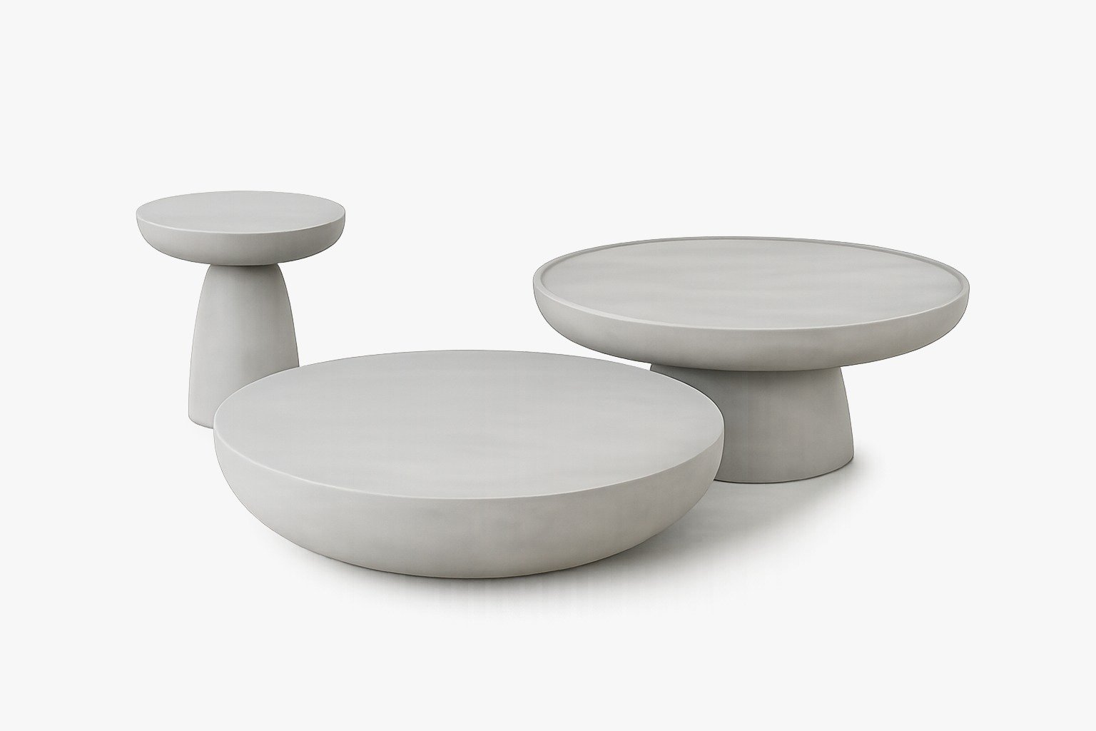 A premium set of coffee tables crafted from high-quality microcement, featuring smooth round tops with wide, stable bases.