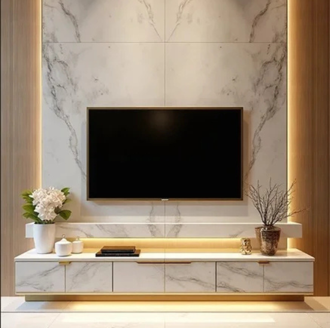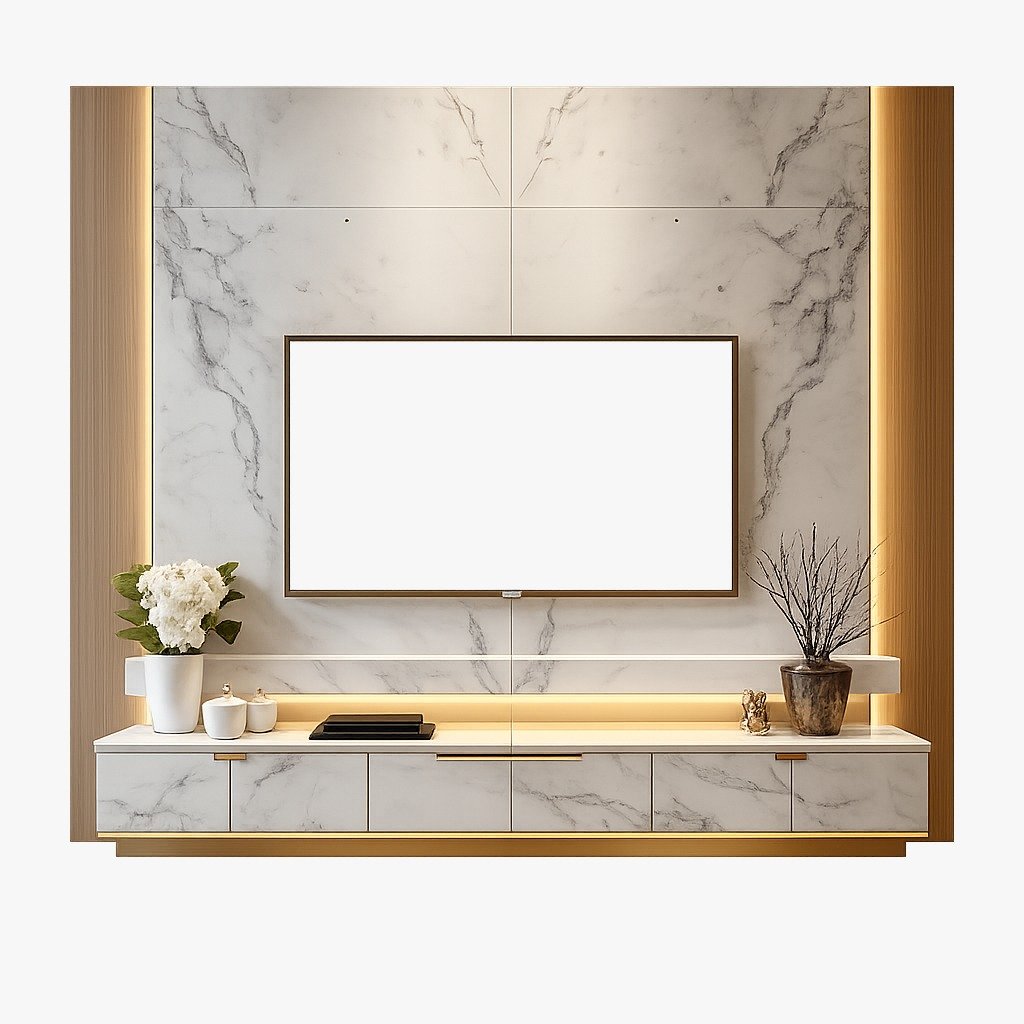 A luxurious TV wall unit featuring premium white porcelain (Statuario / Calacatta) combined with moisture-resistant MR MDF wood and brushed gold accents.