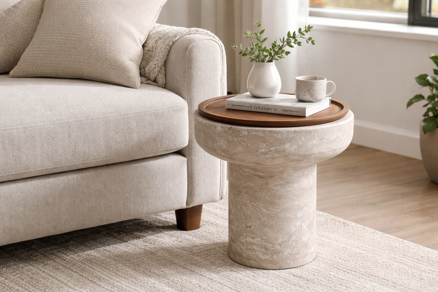 A sleek and modern side table crafted from natural marble and MR MDF wood (moisture-resistant) with walnut or oak finish.
