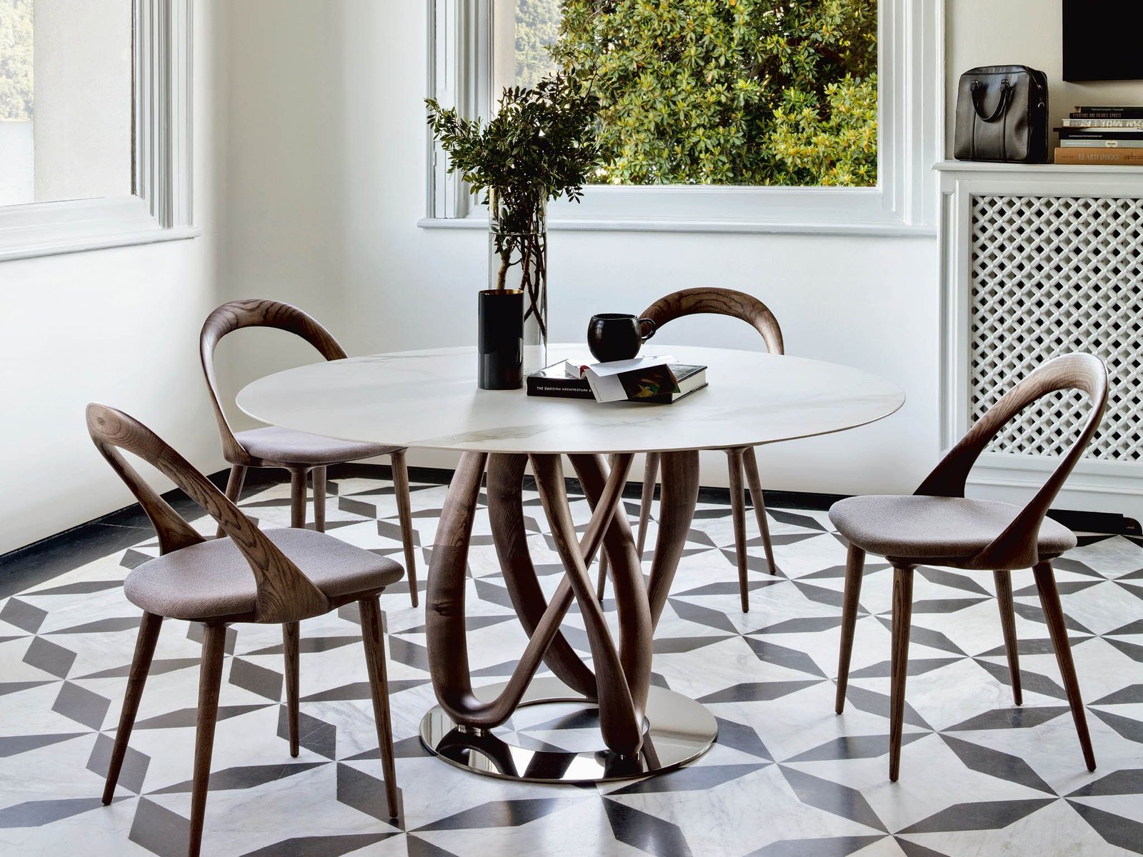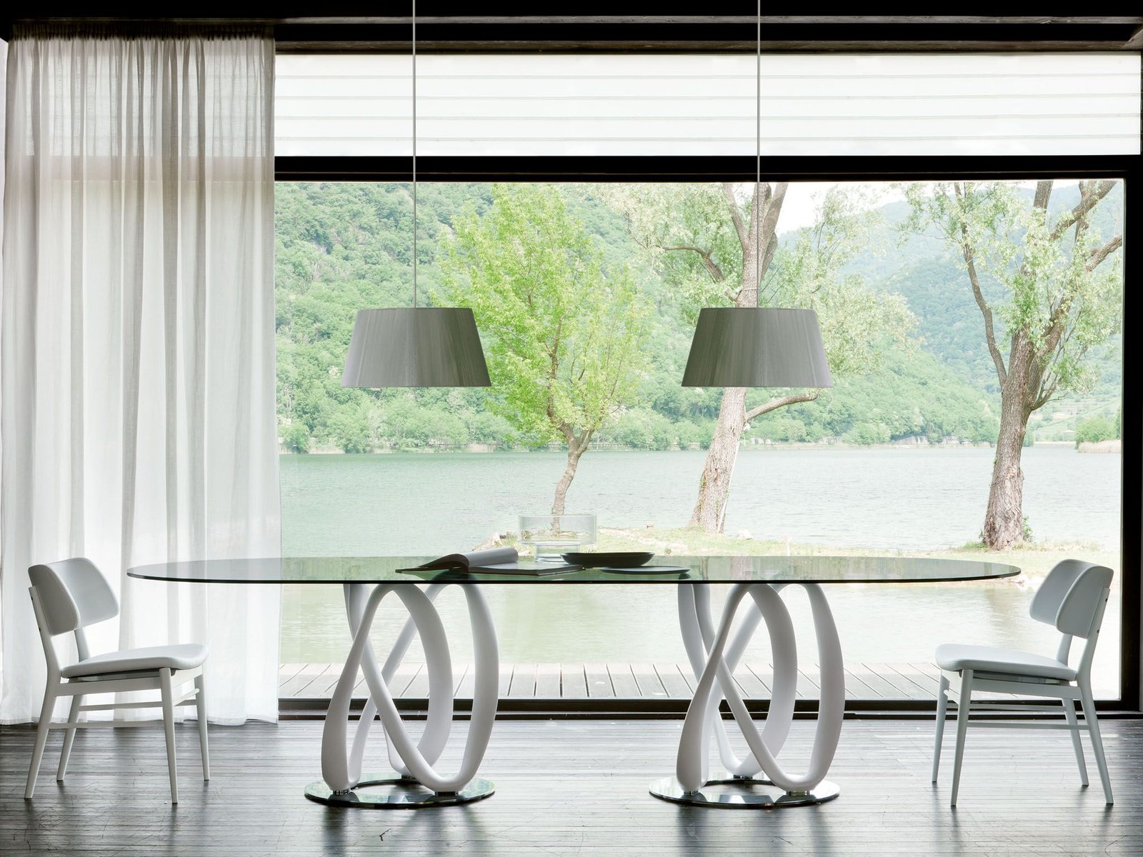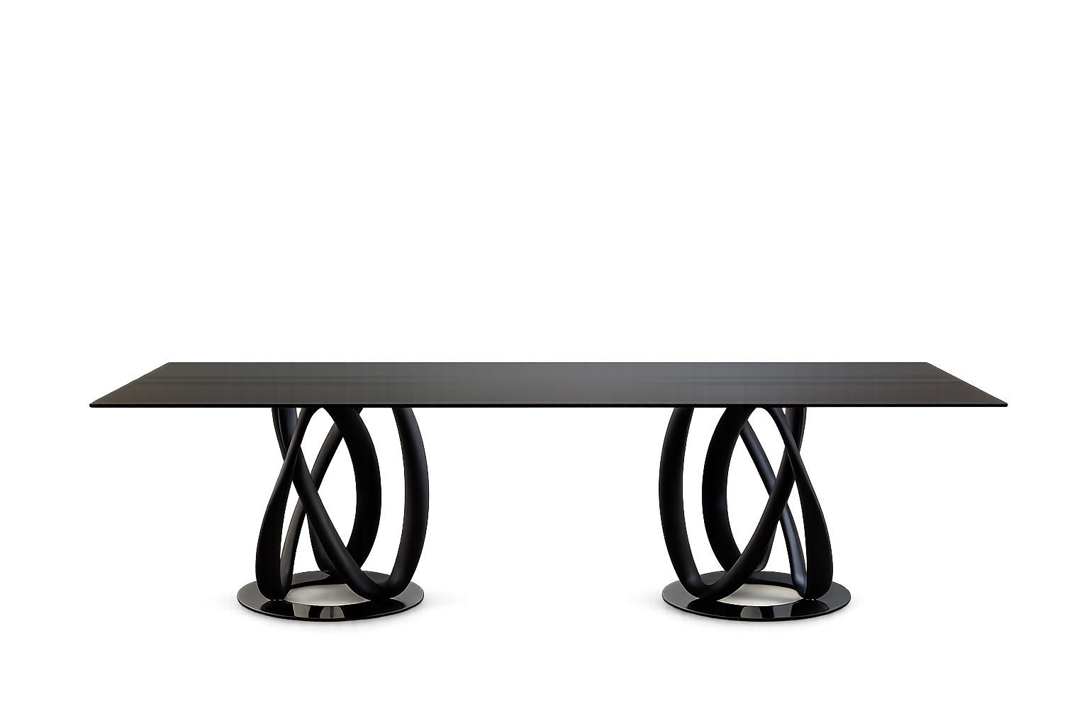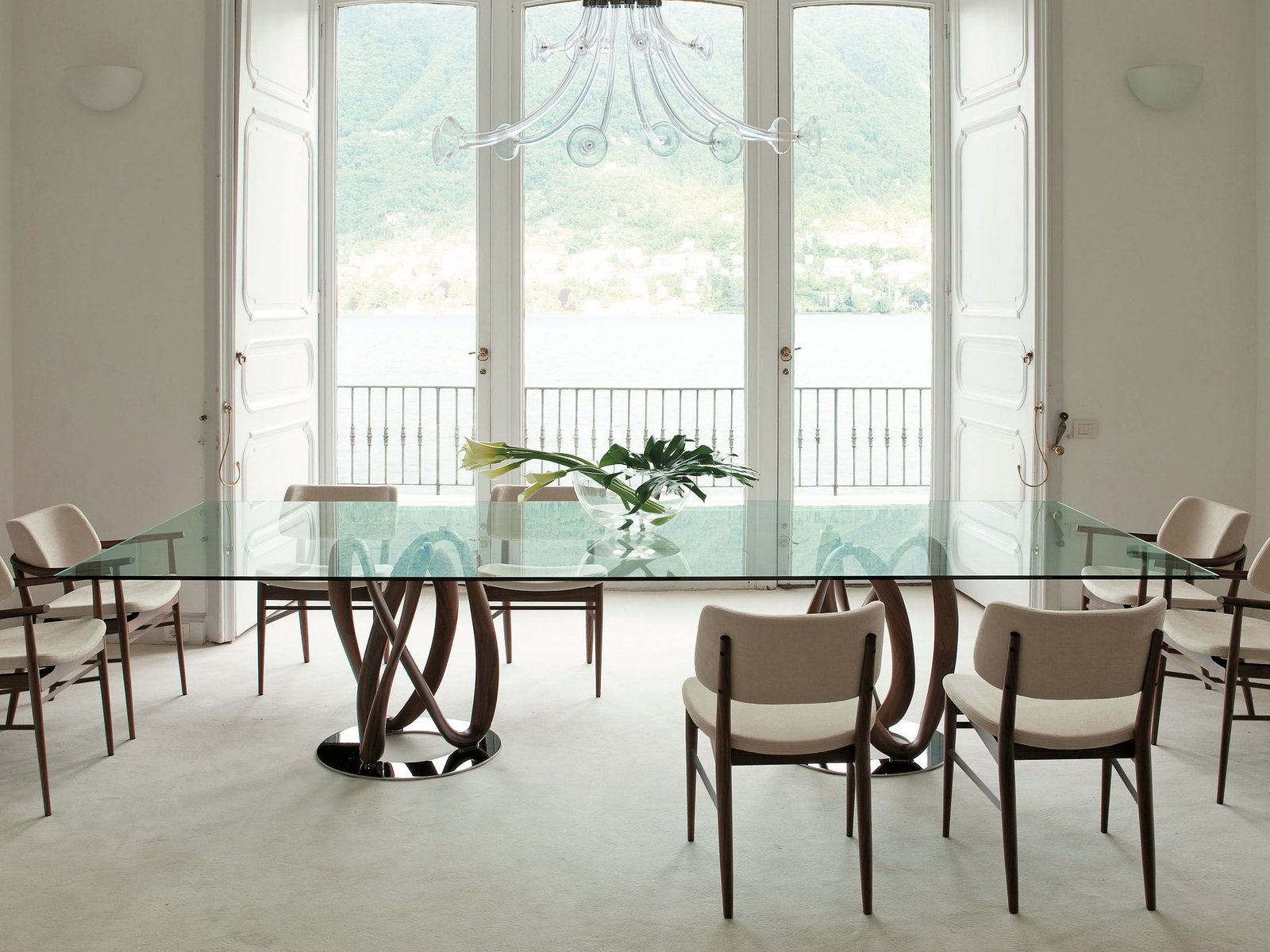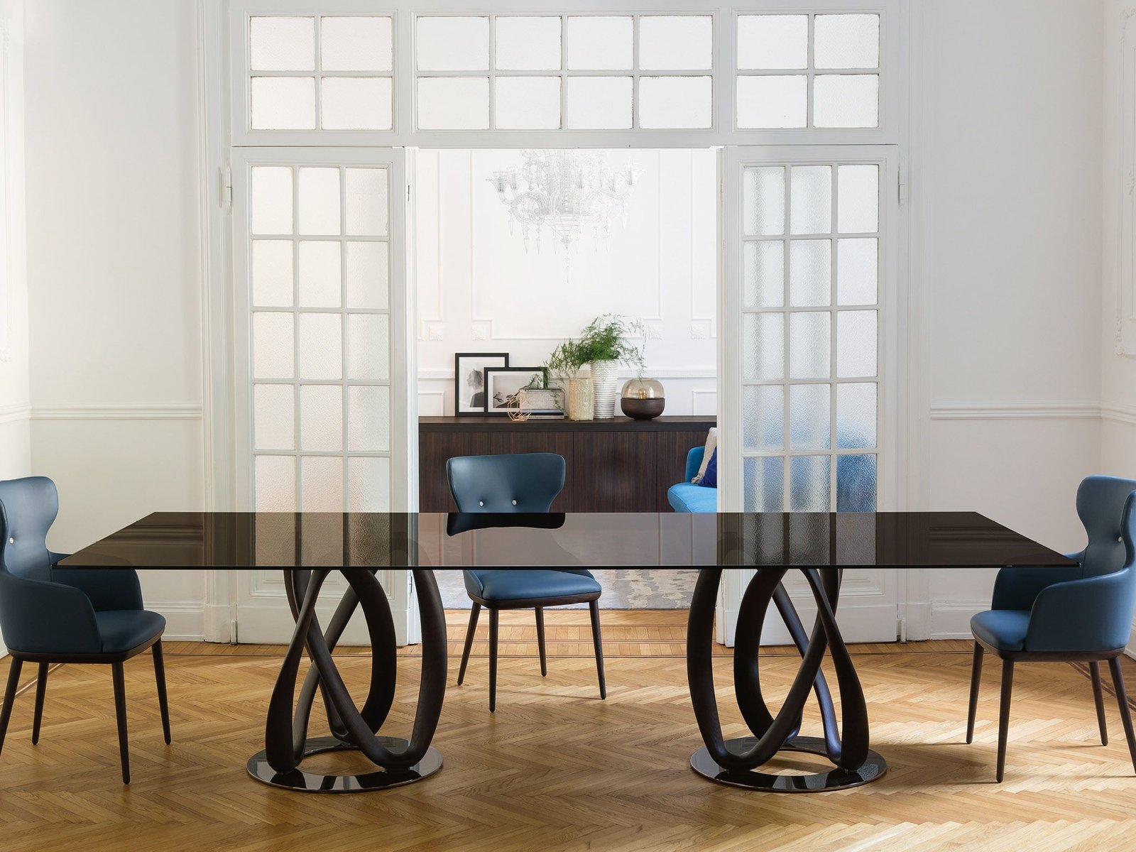 Enhance your dining area with this luxury designer dining table, featuring a sculptural artistic base and available with two premium tabletop options: tempered glass or porcelain surface.