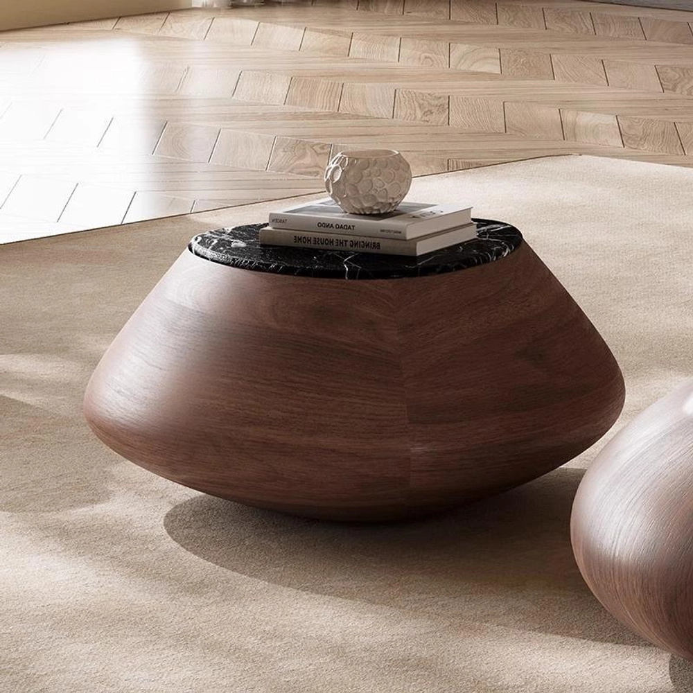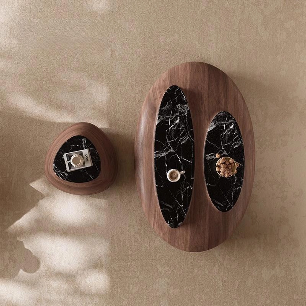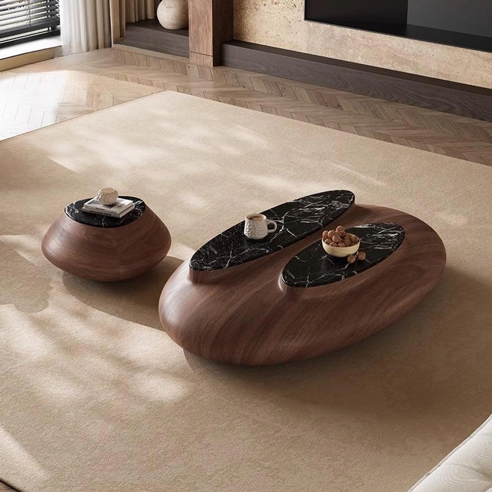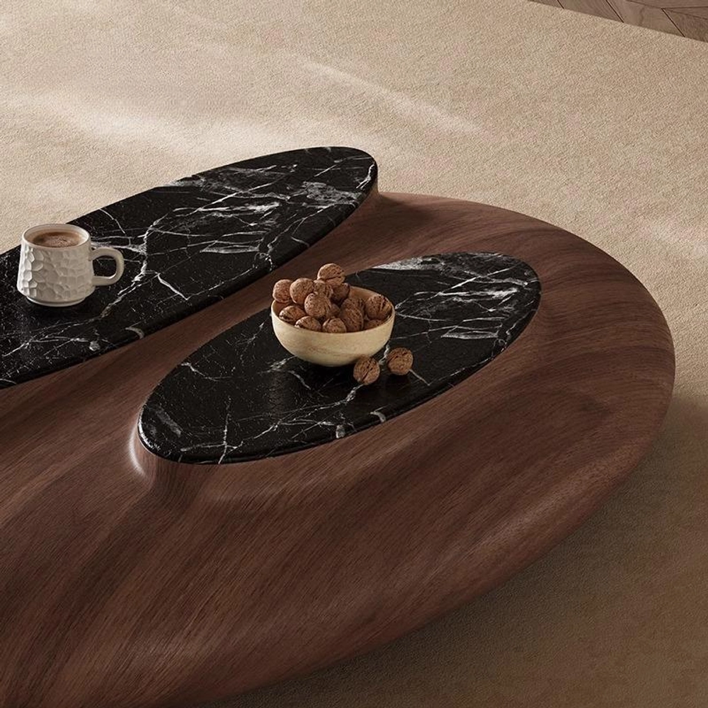 Add a statement centerpiece to your living room with this luxury modern coffee table set, combining natural walnut wood with elegant black marble tops.
