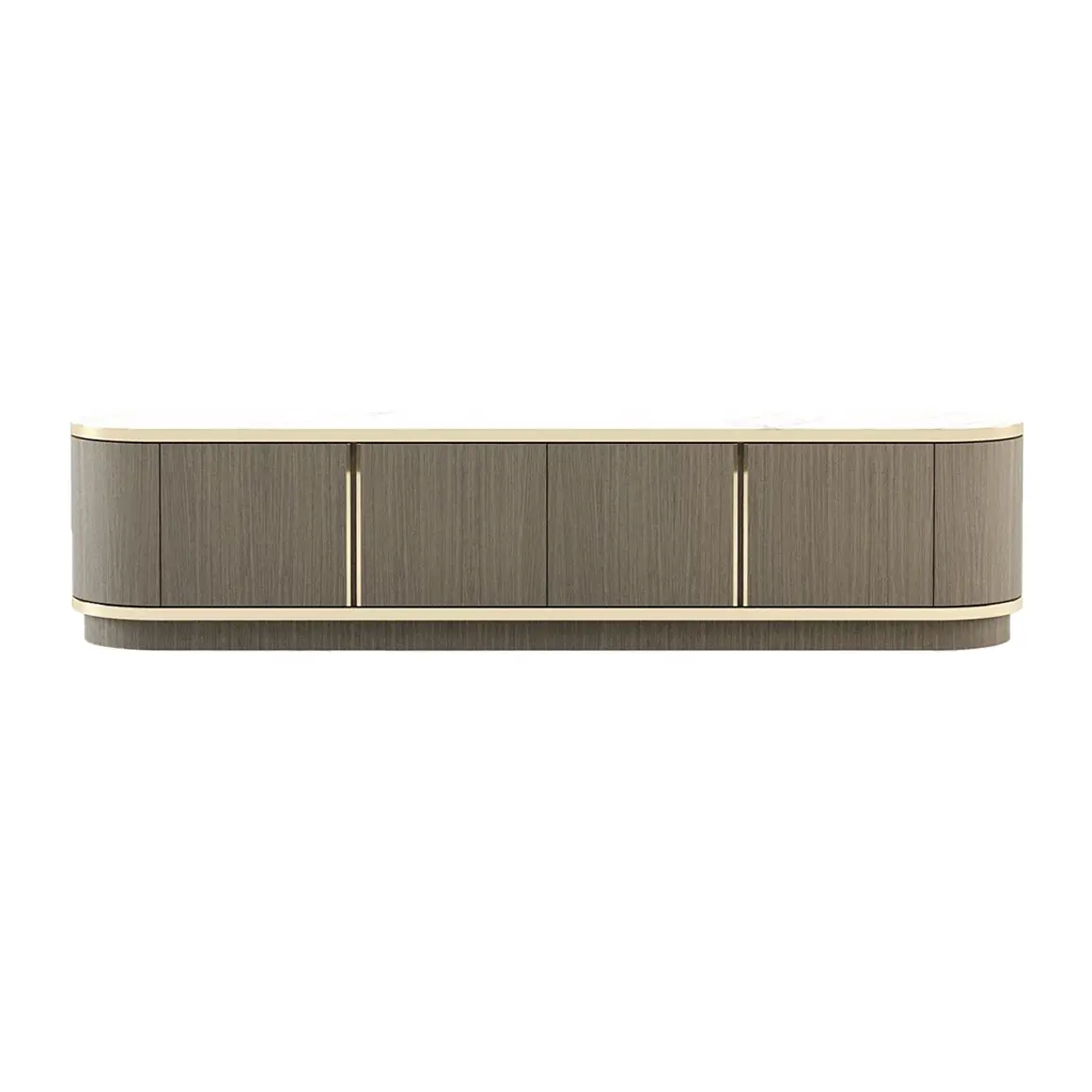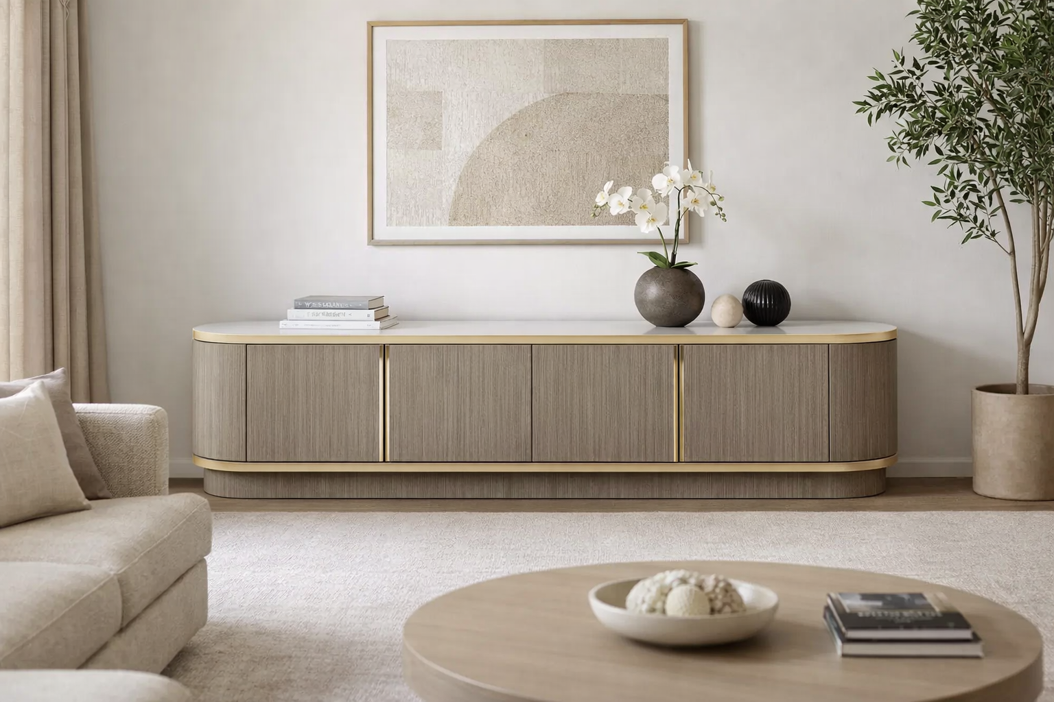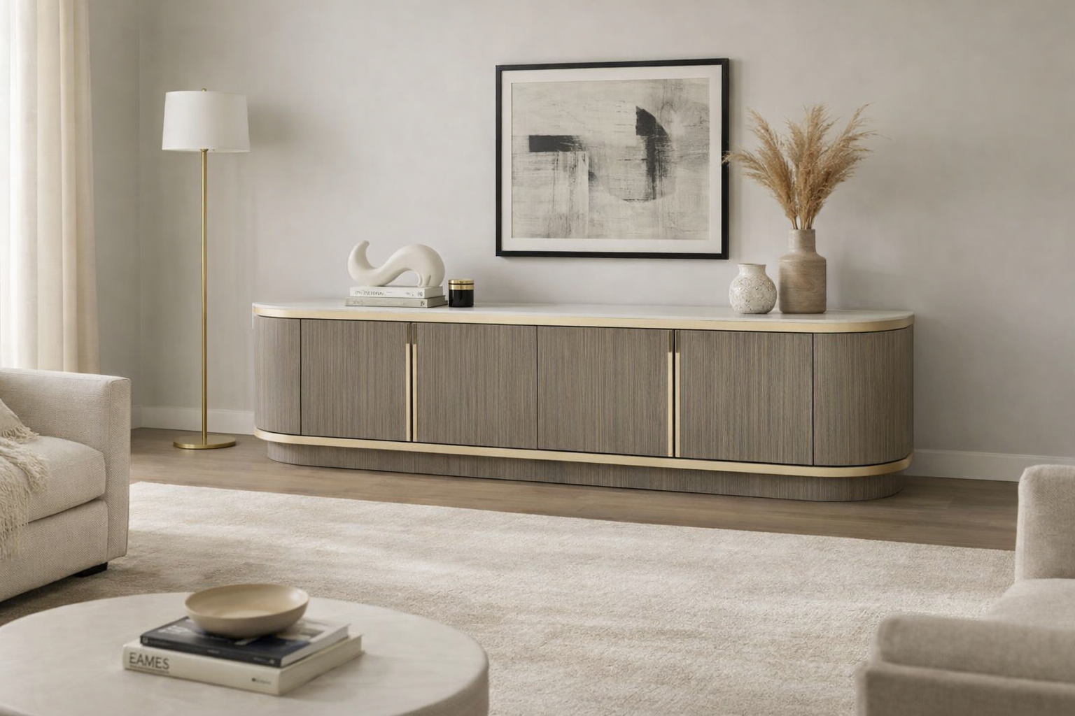 A luxurious modern sideboard crafted from premium MR MDF wood with soft curved edges and minimalist metal detailing for a refined contemporary look.