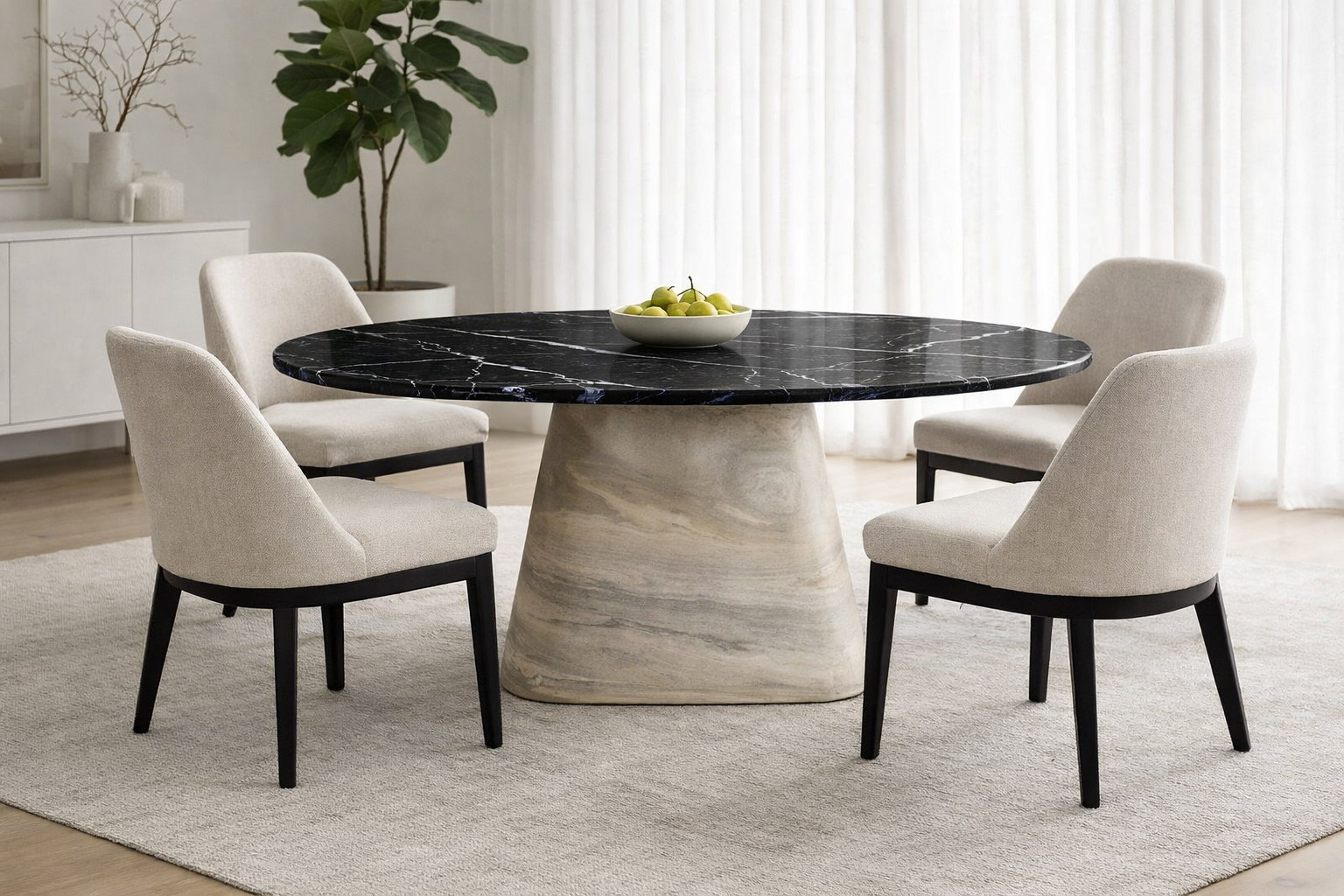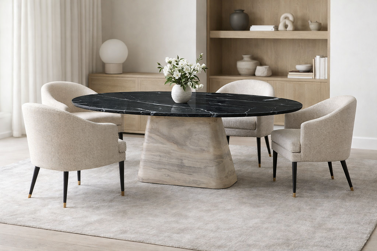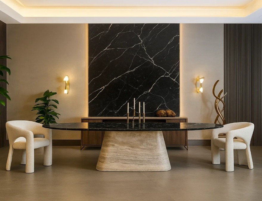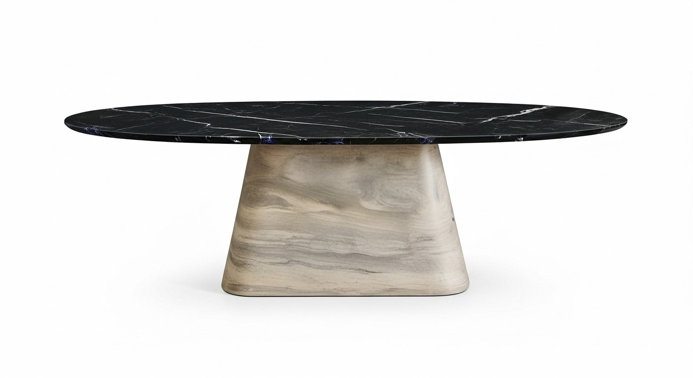 Its refined curves and sculptural base create a bold statement of luxury and durability, making it ideal for elegant dining spaces, villas, or executive meeting areas.
