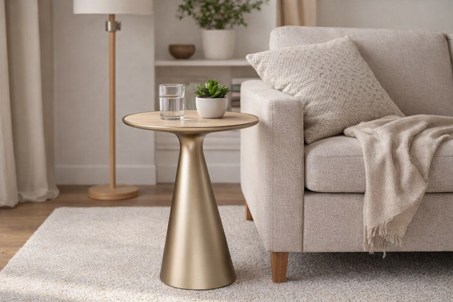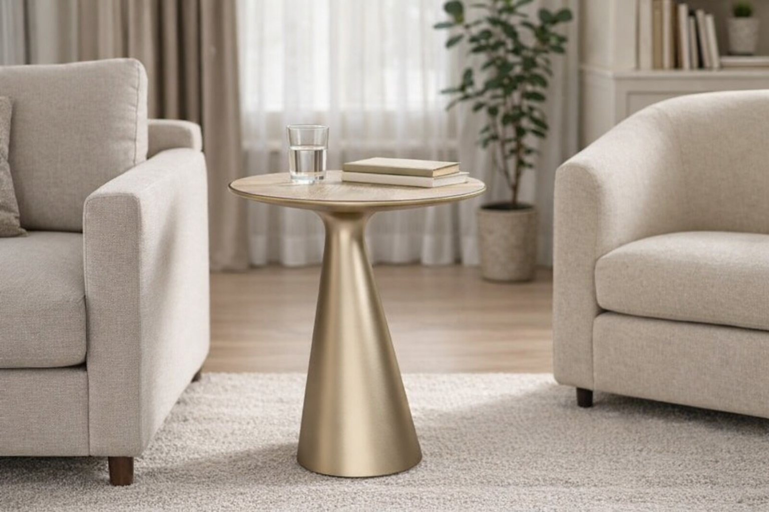 A luxurious side table featuring a premium porcelain top paired with a brushed gold stainless-steel base, combining elegance, durability, and modern minimalism.
